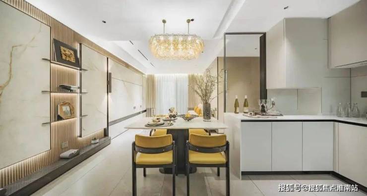 至于餐厅部分,很多正常得房率在75%以下的同等面积段户型,很多只能放下一张两人餐桌或是吧台,再看尚湾林语约93㎡的样板间,却轻轻松松能容纳得了4人餐桌!