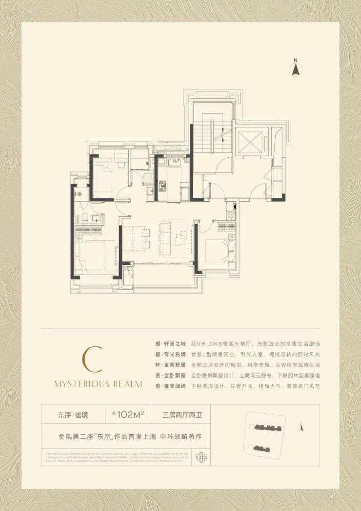 102㎡产品的全新产品,格局上超越了传统意义的三开间朝南,超大尺度的5米横厅,真正实现3.5开间,让业主起居之间沐浴更多阳光的同时,公区尺度感也直逼其他项目建面约100-120㎡户型。