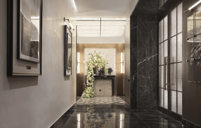 项目打造全石材双归家大堂,入户大堂地面大面积香格里拉黑大理石,墙面配奥特曼米黄石材、莫奈花园大理石,电梯轿厢部分墙面还用上了冷翡翠,会所地面泫雅棕大理石、威尼斯棕大理石局部背景面。