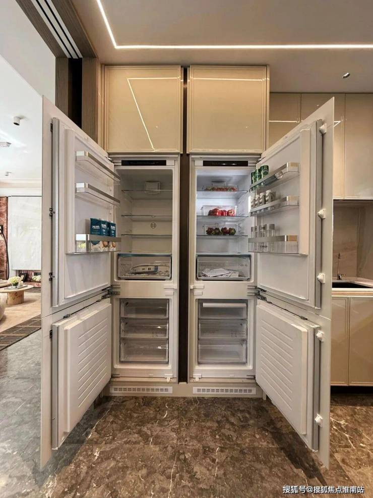 168㎡叠墅的厨房,也迎来了重磅升级,钢琴烤漆橱柜,颜值与质感双双在线;博世全套厨电一步到位:强力油烟机+三眼灶、蒸烤一体机、洗碗机全部备齐,更硬核的是,冰箱也直接升级为了博世: