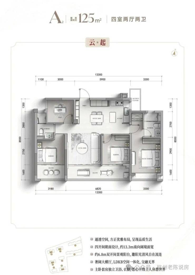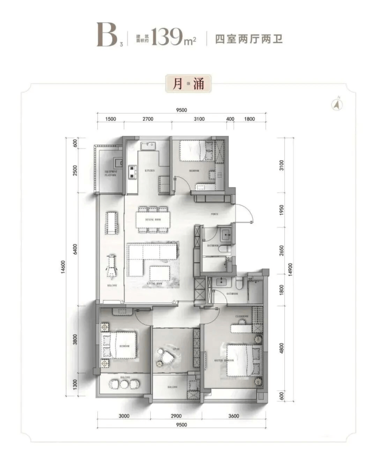 125㎡ 4室2厅2卫(中间套)四开间朝南设计,南向面宽拉满,采光通风效果俱佳;LDKB空间一体化布局,灵活适配二孩家庭日常居住需求;主卧套房设计,配备独立卫浴与专属衣橱,私密性十足;封闭式阳台可灵活改造,进一步提升空间利用率!