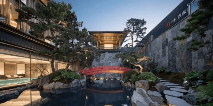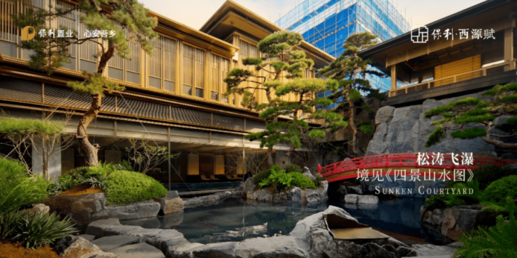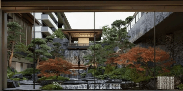 5. 取意三大宋画,融合杭州山水精粹,园林布局「一轴八境」展开,通过假山、叠水、屏风等元素,串联起移步易景的园林场景,再现刘松年的《四景山水图》。