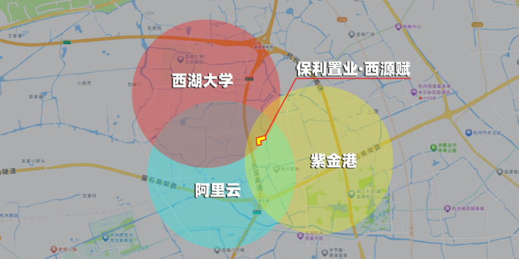 【保利置业·西源赋】是西湖、西溪以北绕城内与蒋村地王并存的唯二新盘。正处城西大走廊的起始点紫金港板块,东南约1.5km即为浙大紫金港校区,直线距离建设中的地铁4号线莲池站仅约660m。