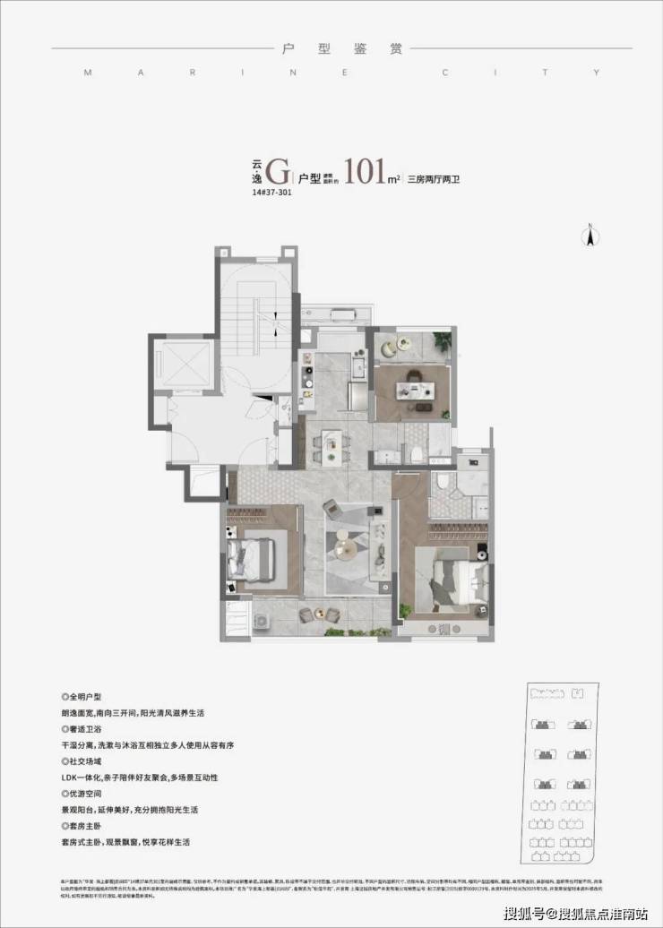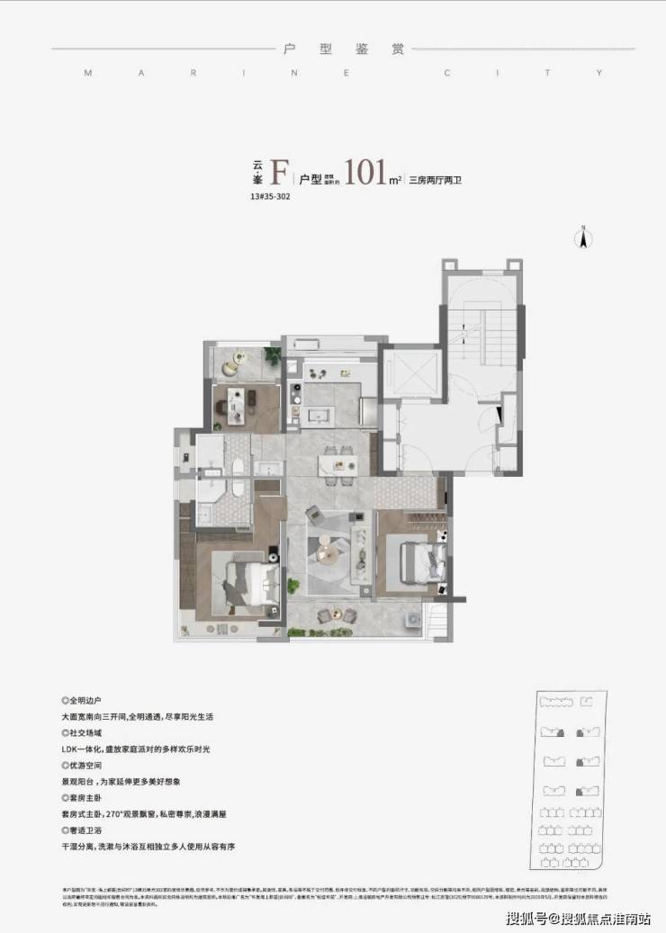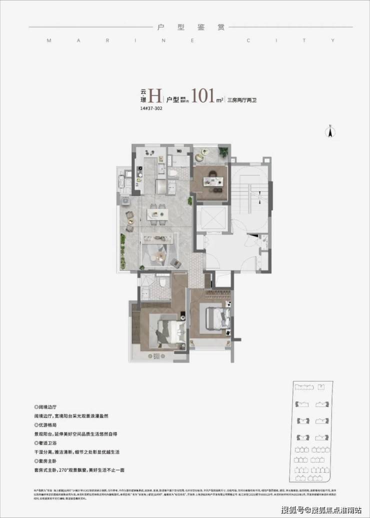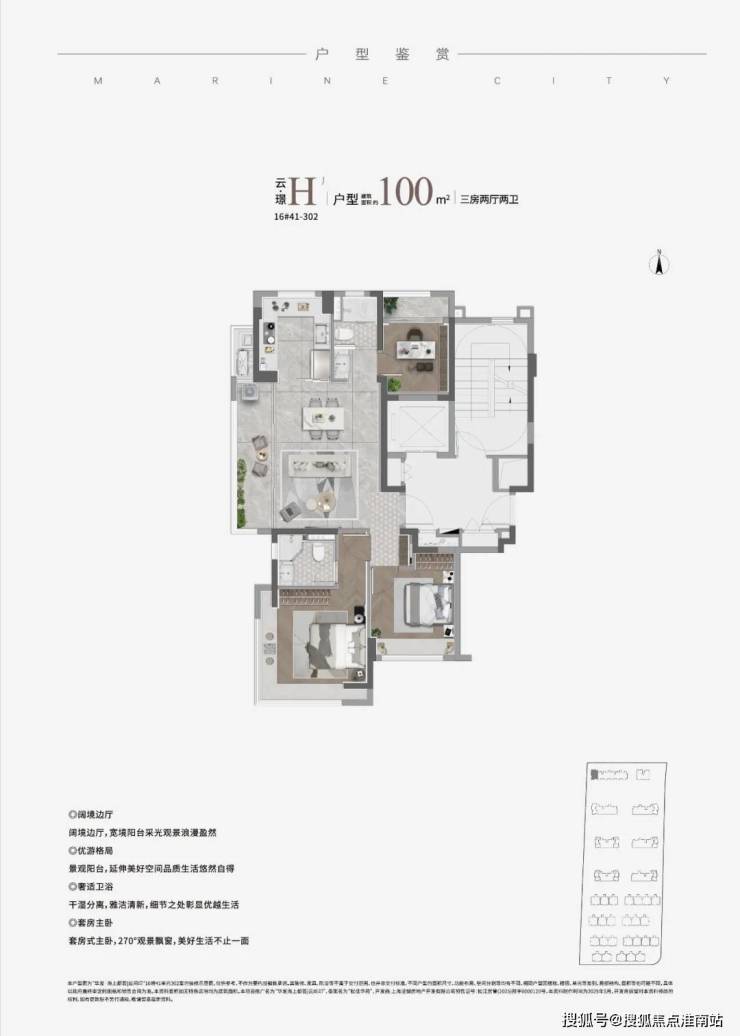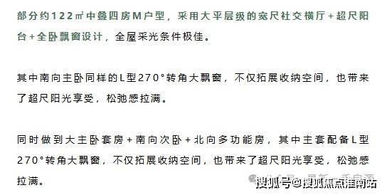 部分约100-101㎡H边厅户型,全景阳台搭配主卧L型转角大飘窗,三面采光+270°环幕视野,景观面堪比豪宅尺度。