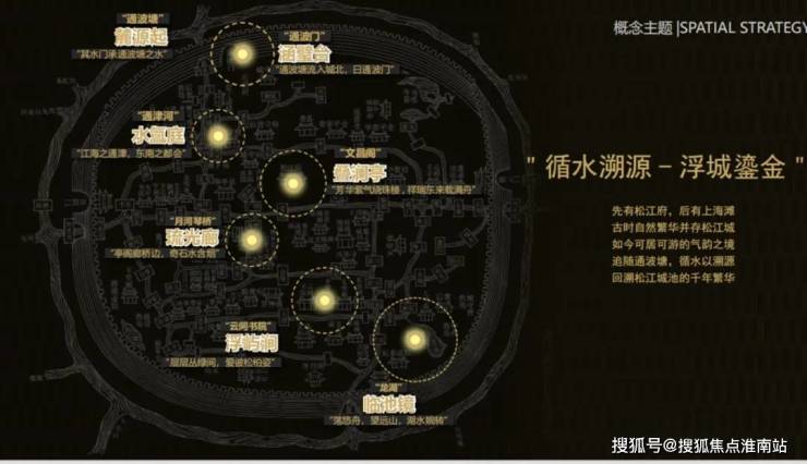 在项目景观设计上由朗道国际景观设计团队操刀(代表作上海融创滨江壹号院、上海万科中兴路一号),从古松江五大浦之一的通波塘上提取灵感,同时以海派水韵为基底,将“循水溯源,浮城鎏金”的设计理念贯穿了整个项目,主打引水入园,让人身临其境、可居可游。