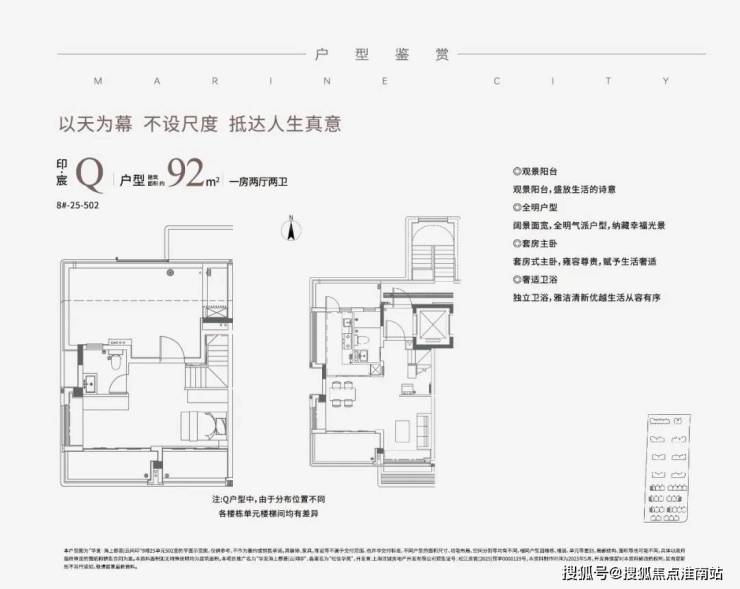 再看总价500万级起的92㎡上叠三房Q户型,下层北向露台+南向阳台花园+餐客一体,上层大主卧套房+南北星空露台,以经济型预算实现“有天有地”的居住仪式感;