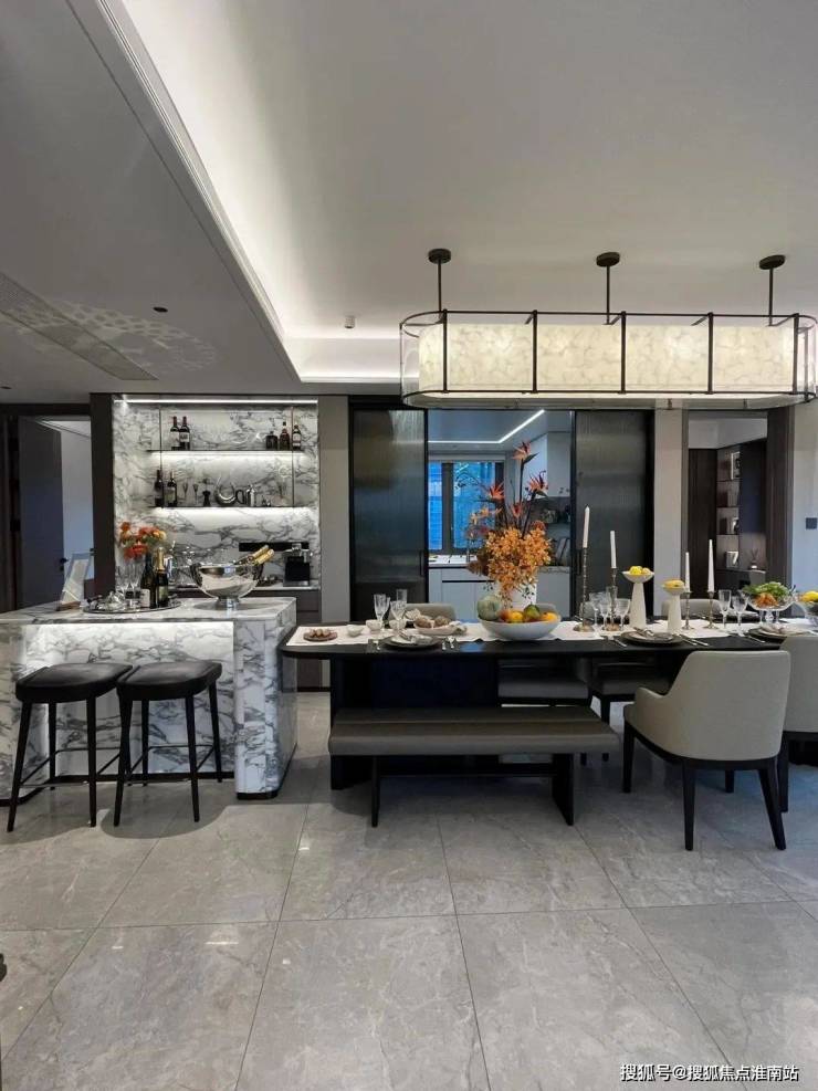 奢石岛台和餐边柜搭配实木餐桌,天然石材的质感和实木餐桌的温馨并存