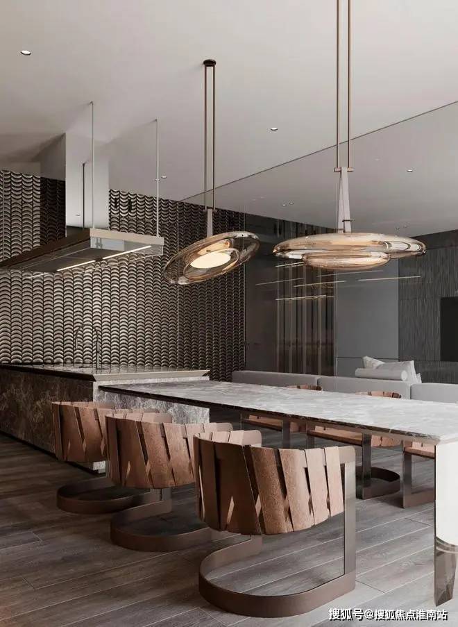 整个餐厅的墙壁和天花板全部使用可视镜作为装饰,把客厅和餐厅的风景全部融合在一起,餐厅的餐桌和大理石岛台完全烘托出现代的氛围感。