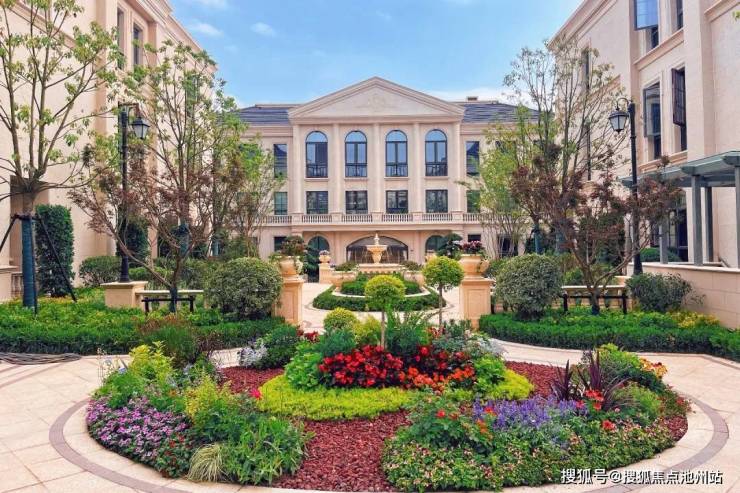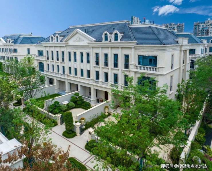 整个园区,以经典的绿城法式墅区景观大中轴贯穿,占地约1000多㎡,联排建筑的设计,融合了中国传统院落布局与法国枫丹白露宫的审美,外立面大面积采用全石材干挂,檐口等细节部位使用仿石。