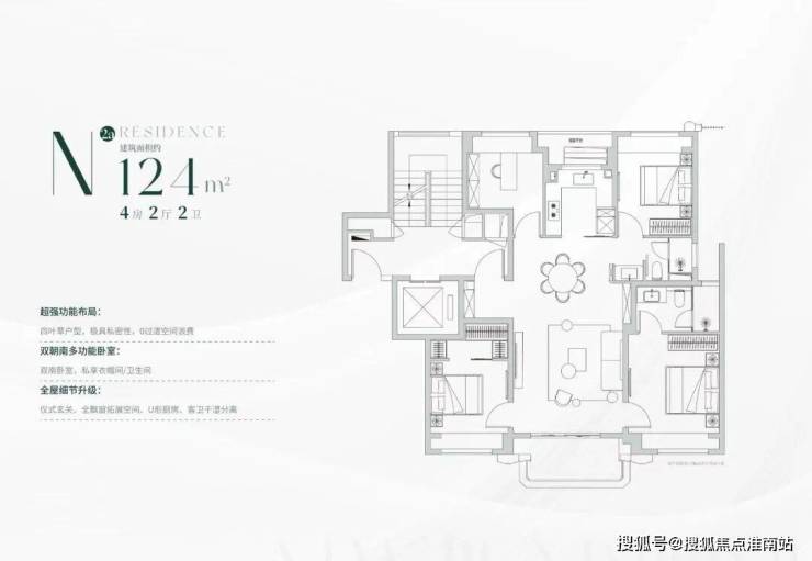 129㎡基本是这次产品线里的“人气担当”。 四叶草格局让四个房间分布在四角,私密性和动线都有保证; 南向三开间+宽尺度客餐厅,让一家人的起居、社交都很舒展。