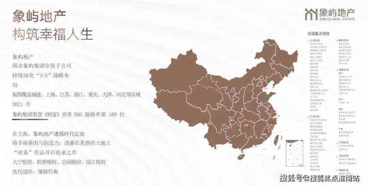 象屿地产,构筑幸福人生国企象屿集团全资子公司,持续深化“3+X”战略布局,版图覆盖福建、上海、江苏、浙江、重庆、天津、河北等区域。2022年,象屿集团荣登《财富》世界五百强榜单第160位。
