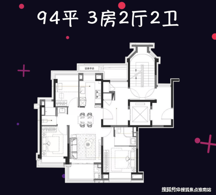 户型方面, 94平的3房2卫性价比不错,总价预计500万起步,飞机户型减少了空间浪费,小房弟觉得最大亮点是电梯双开门的设计, 独立电梯厅相当于送了门口的面积,半小时市中心的地铁盘中,这个户型还是很能打的。