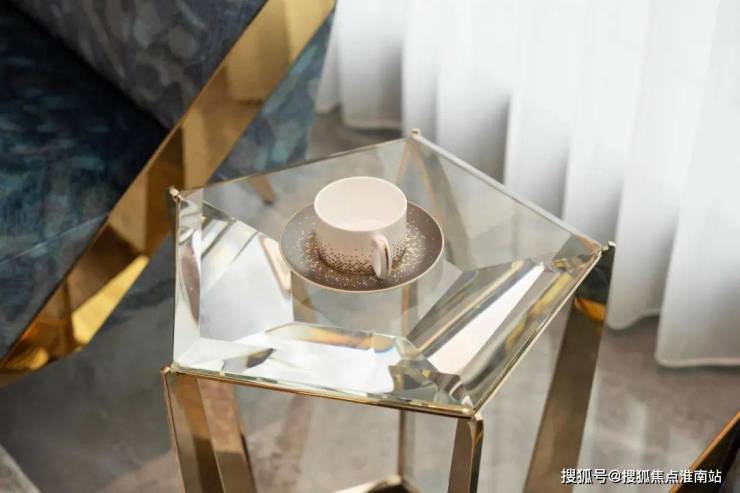 陈女士喜欢温暖的米色调,并希望能在此颜色上带来突破性的变化。设计师在客厅的设计上结合了蓝色和金属元素,用简单的设计手法勾绘富有张力的隽永画面,围合出多元的社交场景。米白色基调的质感沙发和臻粹椅边桌与柔和的自然光结合,在简约的射灯映照下,开启一场华丽低调的盛宴。