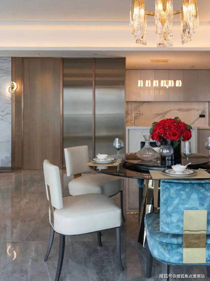 餐厅的布局简洁大方,满足了屋主的日常需求,餐桌选用金属材质搭配亮色布艺筑梦戛纳餐椅,与客厅相呼应,展现空间的一致性。