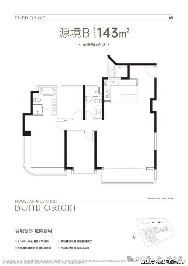 B户型是3房2厅2卫格局,三开间朝南+LDKB一体化+奢阔宽厅+全卧室带飘窗+主卧套房设计+动静分离+主卧270度飘窗,舒适度更高。