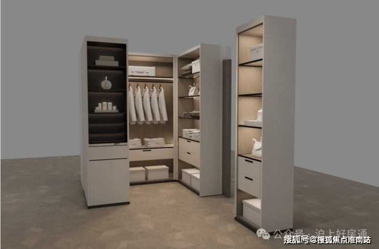 主卧和约99平户型一样,衣柜更大形成衣帽空间,还交付有半开放式、类似于酒店的迷你吧设计:
