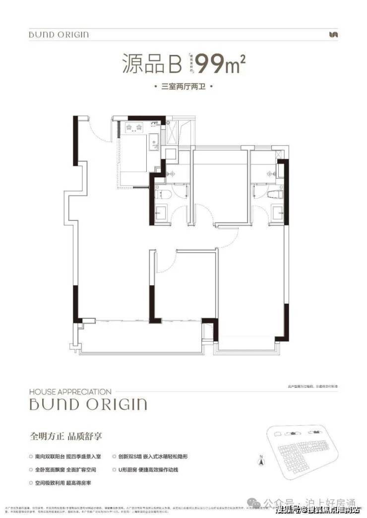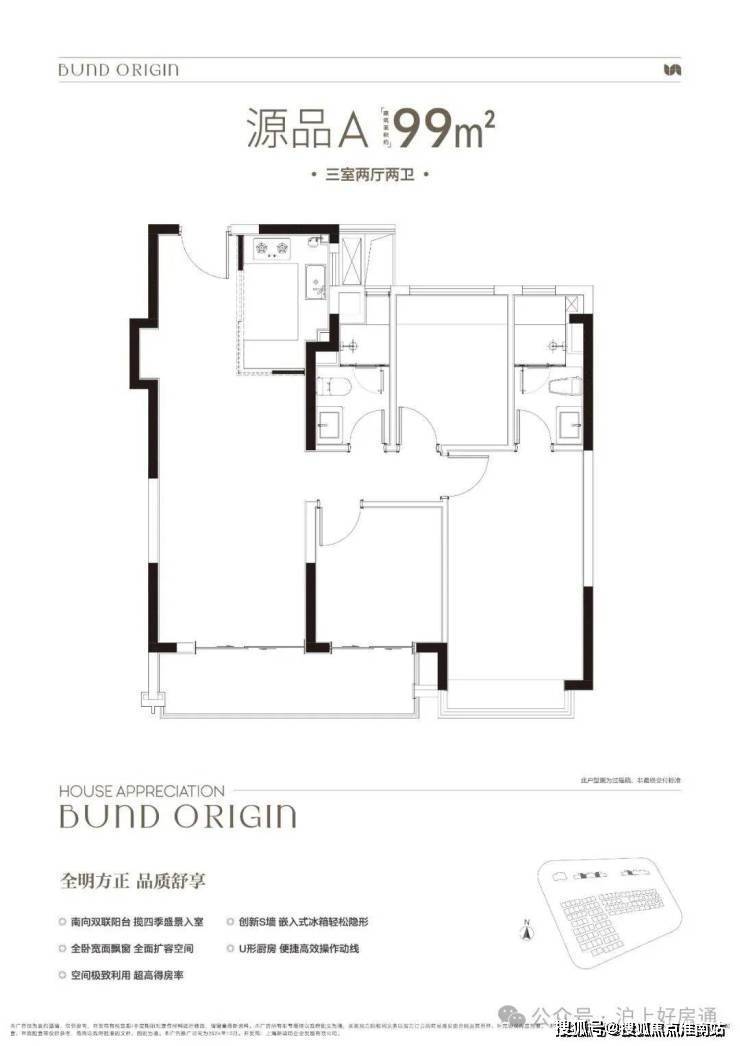 建面约99㎡3房2厅2卫,非常标准的动静分离、三开间朝南户型。