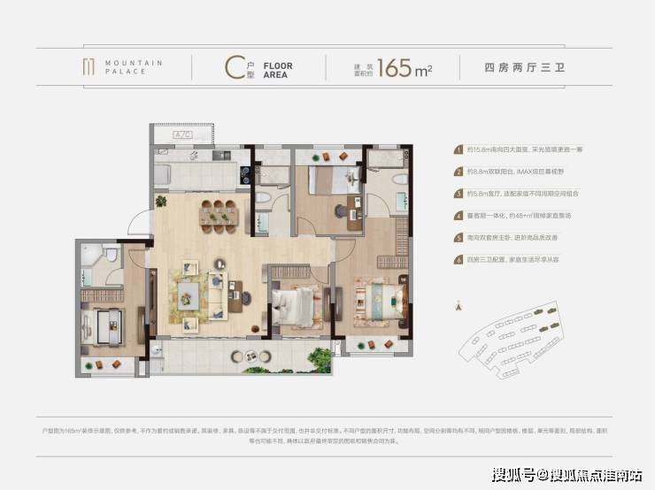 户型:主推125-165㎡四房,采用大横厅设计(最大开间6.8米)及全明格局