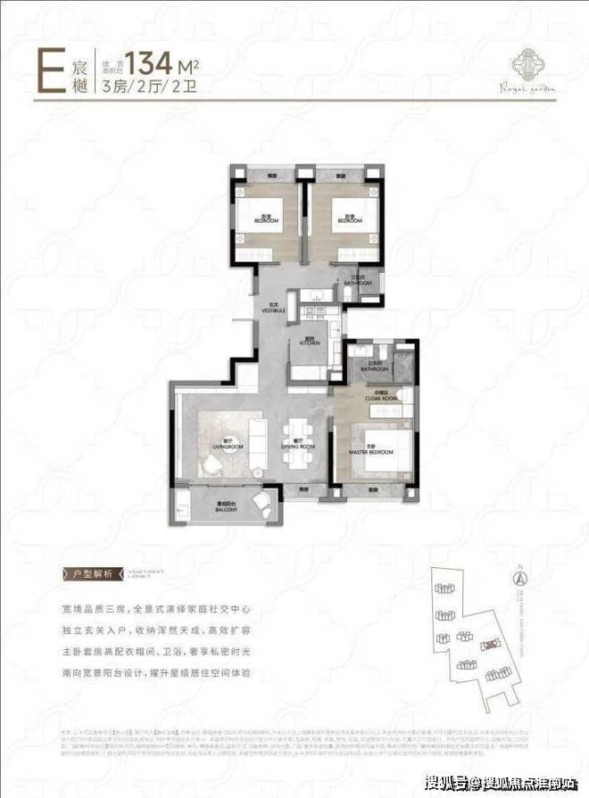 104㎡3户型特点:该户型多为楼栋的东边套,是一个观景户型。客厅连接270°阳台,视野出众。双卧朝南,阳光满溢。从次卫布局看,如果家庭人口较少,该户型还能做成双套卧。