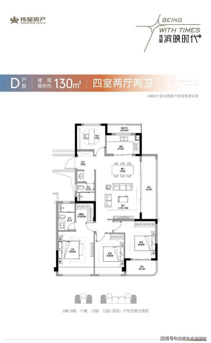 想改善一步到位的购房者还有建面约130方4房:最大的 建面约130㎡则是舒适四房格局,这个户型最大的亮点在于 双阳台,除了侧边横厅连接一个建面约9㎡的阳台,南面的次卧还连接着一个小阳台。