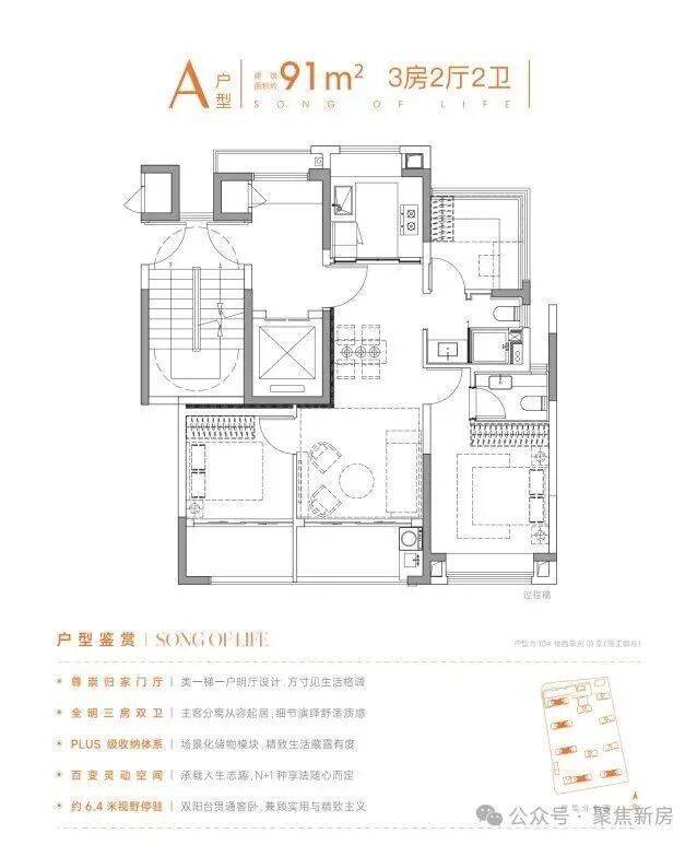 建面约102㎡三房两卫则主打“舒适升级”