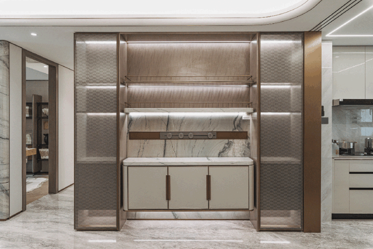 地下归家大堂用材选取意大利进口岩板,色泽温润,和谐统一。人脸识别自动移门便捷实用,金属夹丝玻璃美观大气,开阖家的尊崇与安心。