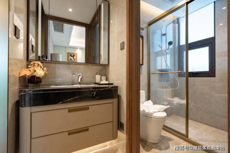 卫生间甄选唯宝的台下盆、汉斯格雅的龙头+恒温花酒,玫瑰岛的淋浴房,科勒的智能一体马桶+浴缸+浴缸龙头等 , 生活质感肉眼可见。