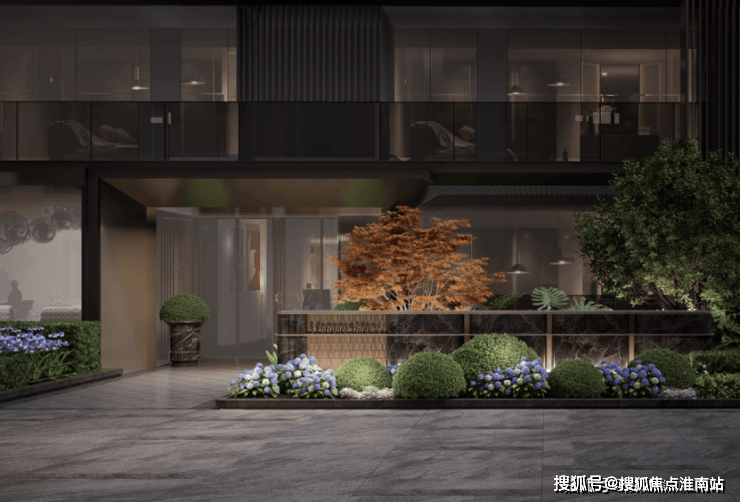 在社区门头上,采用麻省理工学院同款人文高定门头,上海少有的长约35⽶、高约5.1⽶酒店式迎归尺度,并引入价值不斐的名贵黑松、范思哲黑石材与茶色定制铝板,以秀于外隐于内的精神表达,给予每一位业主的尊贵仪式感。