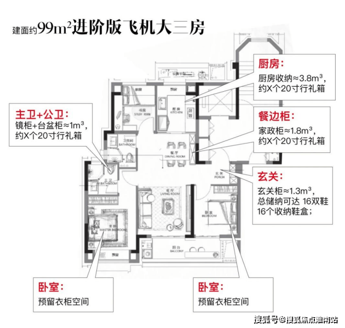 先来看建面约99㎡3房产品,非常经典南北通透飞机户型,几乎不存在冗余的走道空间,实现了空间利用的最大化。三开间朝南布局超宽采光面,增强了室内的通透感;主卧配备舒适飘窗,阳台横跨客厅和次卧,进一步拓宽了生活空间。在细节上,入户玄关、主卧套房等实用性与品质均有兼顾,这是一个真正高居住舒适度的上车产品。