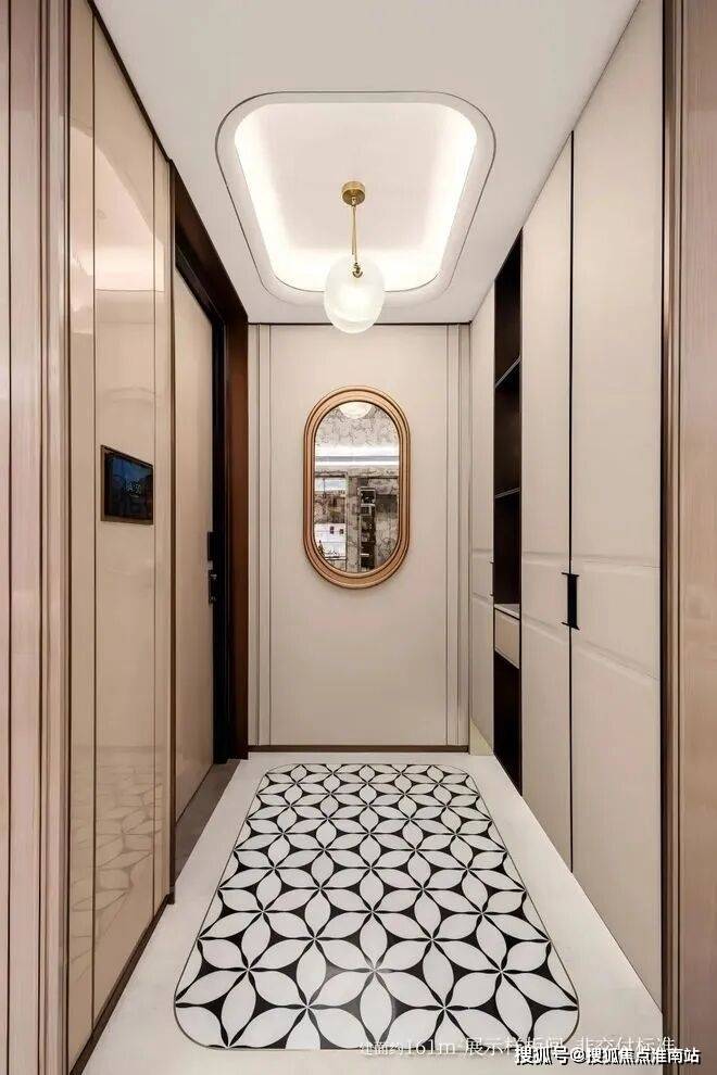 步入室内,玄关收纳柜体均已定制完成,地面精选“黑色墨玉”与“雅士白玉”天然大理石,采用水刀拼花工艺精心铺就成白玉兰等典雅图案,铺陈归家的第一重仪式;
