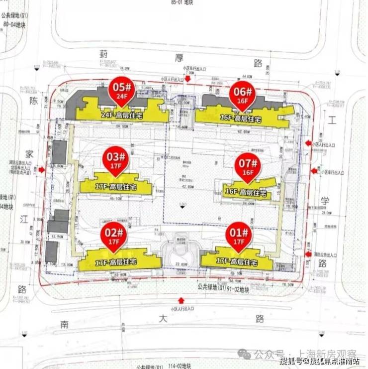 92-01地块拟建6栋15-17F高层住宅产品,并且全部做了首层架空。值得一提的是,项目小区出入口做了景观架构,在3号楼与5号楼之间做了下沉庭院,并在小区中央配置了1623.59㎡的集中绿地。