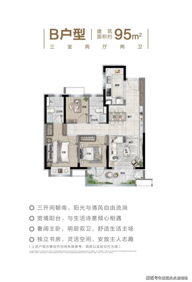 约95㎡的3房2厅2卫户型,这个户型的实用性太高了。能保证业主从二人世界到二胎家庭的全生命周期需求。