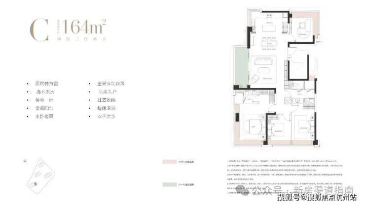 建面约164–165㎡四房两厅两卫:四开间朝南,主卧套房设计
