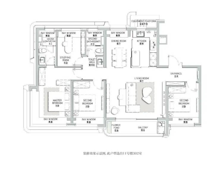 建面约120㎡的户型,定制LDKB一体化宽厅,更舒适的功能定制,270°转角窗观景套房设计,实现了居住品质与观景的完美结合。