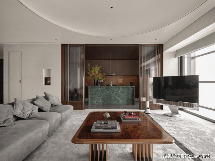 龙盛荟馆的接待处设计:空间讲究对称性、秩序感,暗绿纹哑光、温润的石材+仿铜金属板,调性和仪式感极佳,家具的选品又富有居家轻松氛围,有种俱乐部的感觉。