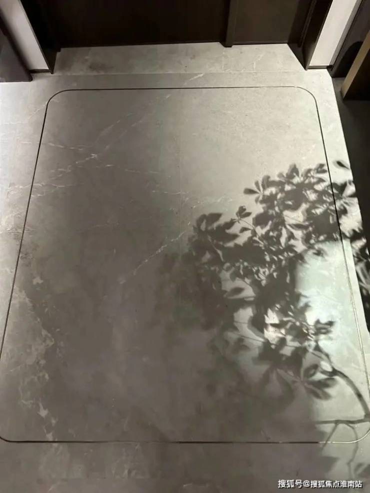 这个是入户玄关处的地面,大理石地面搭配金属线条勾勒出玄关地界,归家的氛围感从这个区域就开始了~这还不是重点,玄关座椅背后,是一面皮革包裹的墙面。鞋柜下方做了悬浮处理,同样也是内嵌灯带,这里灯光的角度还会再调整,因为灯光映射在大理石地面上,要显得尽量柔和不刺眼;同时,鞋柜下方可放拖鞋,还能放扫地机器人,便于日常清扫打理。鞋柜的饰面,纹路方向统一,呈现出极强的协调感。