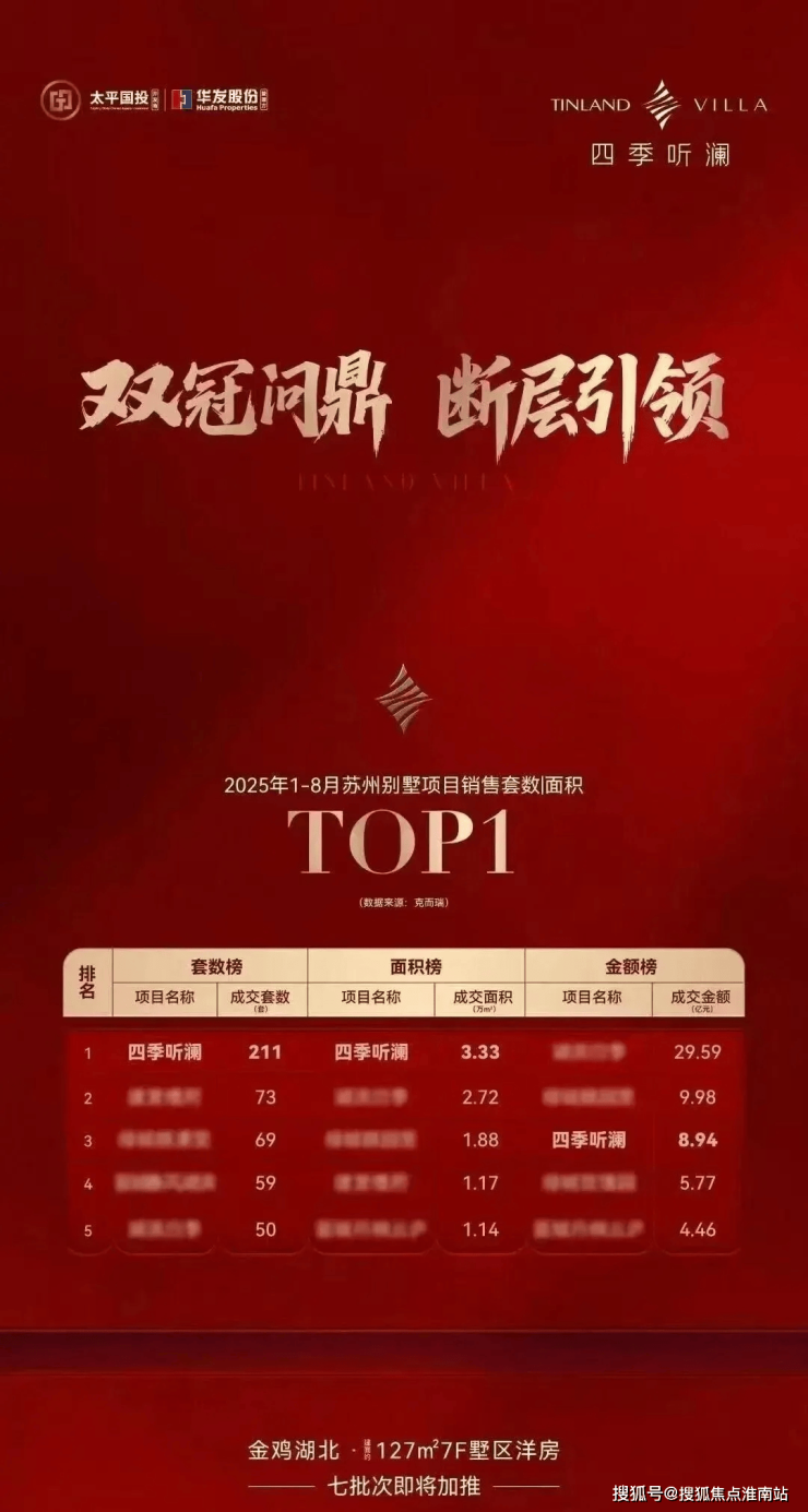 不仅如此,一年来四季听澜一路热销狂飙,多次狂揽苏州市别墅类项目成交套数TOP1,相城区套数、面积、金额三冠王,苏州1-8月别墅项目套数、面积双冠王。
