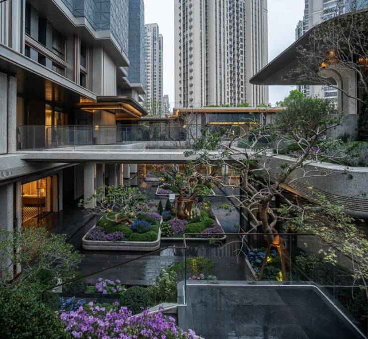 芳汀花园: 核心水景用了宇宙黑金奢石,纹理深邃如星云,配上四株对称的香橼树,这种“对称美学”极其治愈。