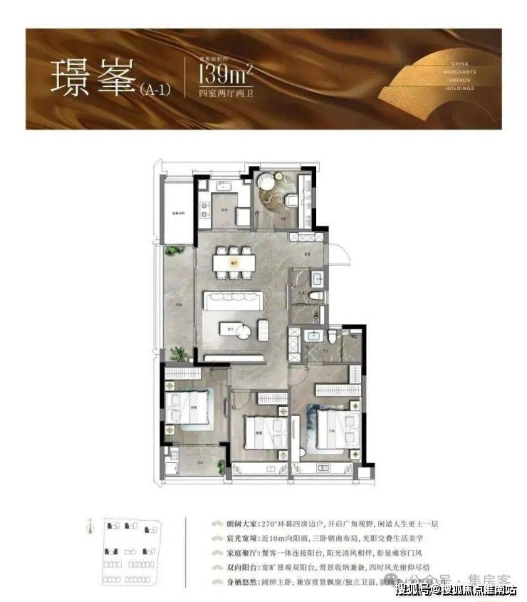 以中间套为例,建面约123㎡的户型做到了主次卧+客厅 四开间朝南,伸展开约13.3米的超大面宽,对应双开间阳台与飘窗的设计,进一步提升了全屋的采光。此外,一体化的餐客厅,“一镜到底”活动空间,在视觉上拉大了户型的朗阔尺度。
