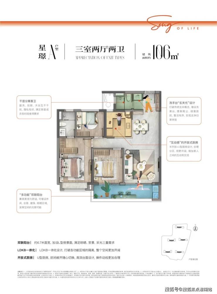 约106㎡户型点评:双联阳台约6.7米面宽,加设L型俯景面,满足晾晒、赏景、采光三重需求,LDKB一体化设计,打破各功能区域的隔离,整个空间更加开阔,开放式厨房 U型厨房,封闭敞开随心切换,高效台面设计,操作动线更加合理!