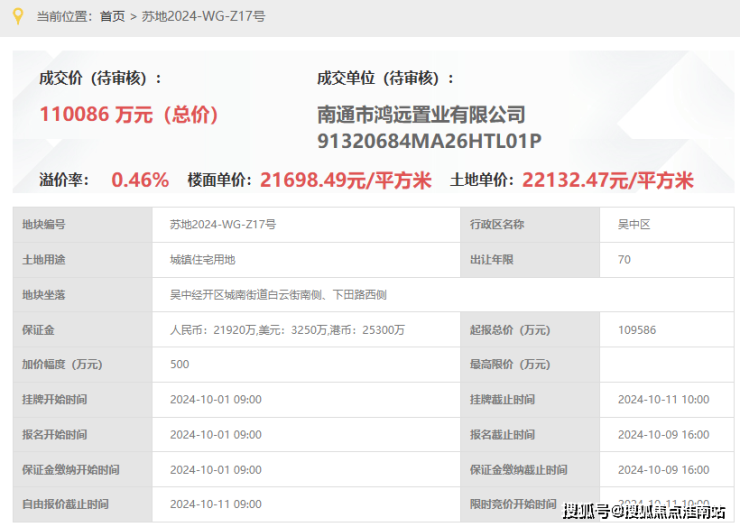 该地块(苏地2024-WG-Z17号)是南通市鸿远置业(南通海门国资背景)以总价11.01亿竞得,楼面价:21698.49元/平,溢价率0.46%。鸿湖上售楼处线上预约看房热线电话:400-8815-114(24小时热线)