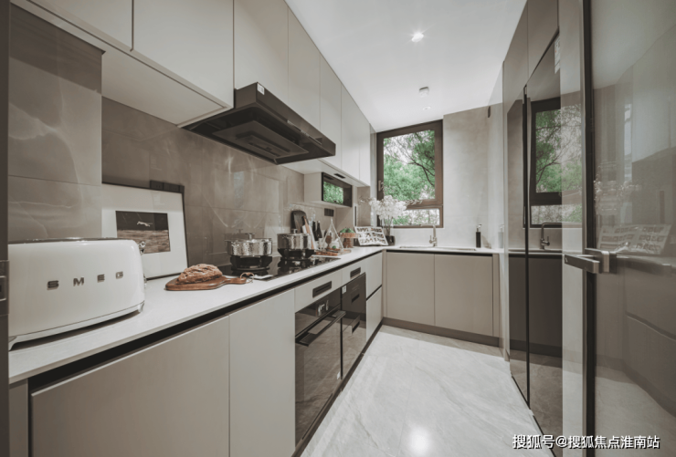 厨房配置硬核,配博世五件套( 燃气灶、油烟机、消毒柜、蒸烤机和冰箱);搭配弗兰卡水槽,耐用性与实用性兼具;