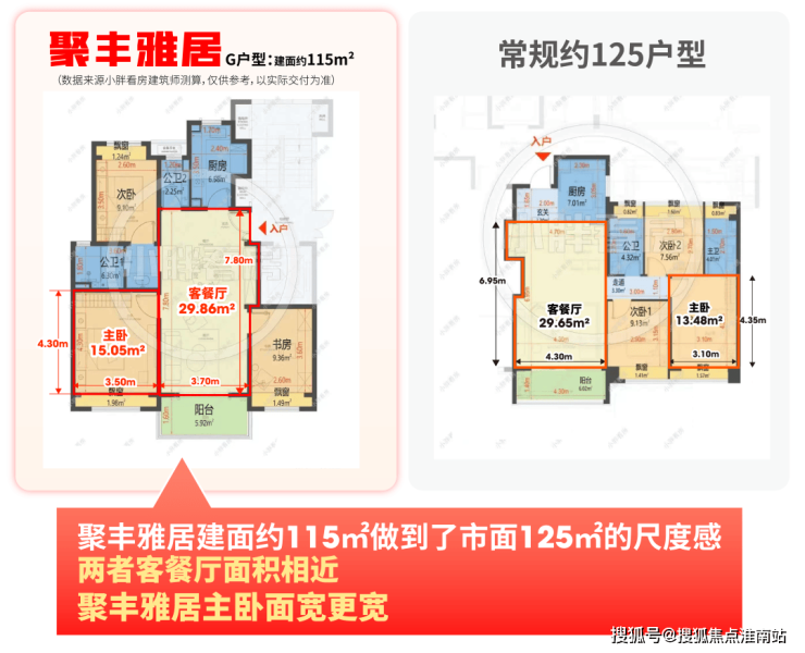 实地参观能明显感受到客餐厅、卧室的空间感比同级新房更开阔,数据对比更能印证这一优势:以建面约115㎡为例,其空间尺度已接近市面125㎡户型水准。