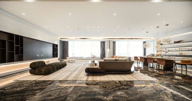 百年罗汉松 造价千万石材 约11米挑高大堂让想象力不再受限:大堂挑高约11米,仅石材用料价值千万,地面采用名贵进口石材劳伦黑金,成就身份与地位的彰显。顶部汲取德国世博馆设计灵感,通过材质分隔,演绎力量感与艺术气息。恢弘气势与毫厘细节,可按需定制全场景美学,
