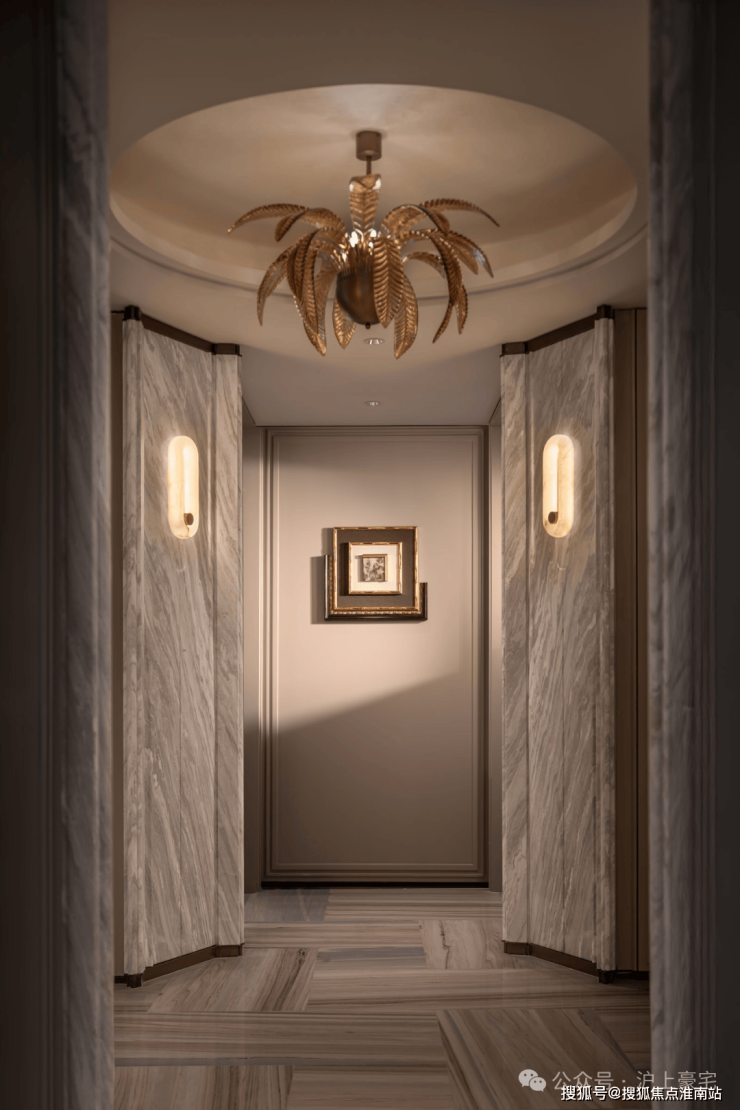 采用米黄色温润石材,巧妙模拟风的流畅形态,营造出既庄重又舒适的归家氛围。这片宽广的流线型石墙在柔和灯光的映衬下,更显璀璨夺目,而风雨连廊的灯带设计,更添一份尊贵仪式感。