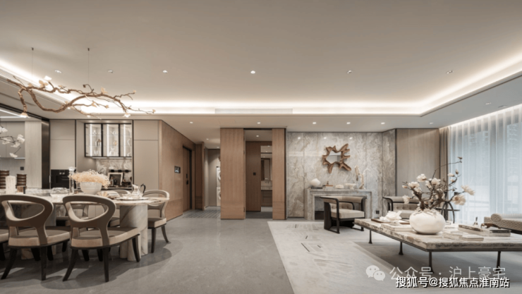 宽厨房与一体化共享空间:与客餐厅等宽的厨房,解决了豪宅往往觉得厨房过于局促的问题。这样的厨房,不再仅仅是功能化空间,而是与岛台一起组合成家庭厨师长的个人秀场。