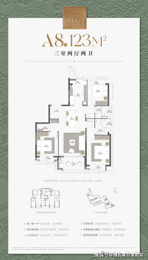 康定壹拾玖售楼处电话☎:400-998-9694✔✔ 建筑面积约123㎡三房户型,飞机式布局,一镜到底的LDKB长厅,尽显隐贵静安风范;