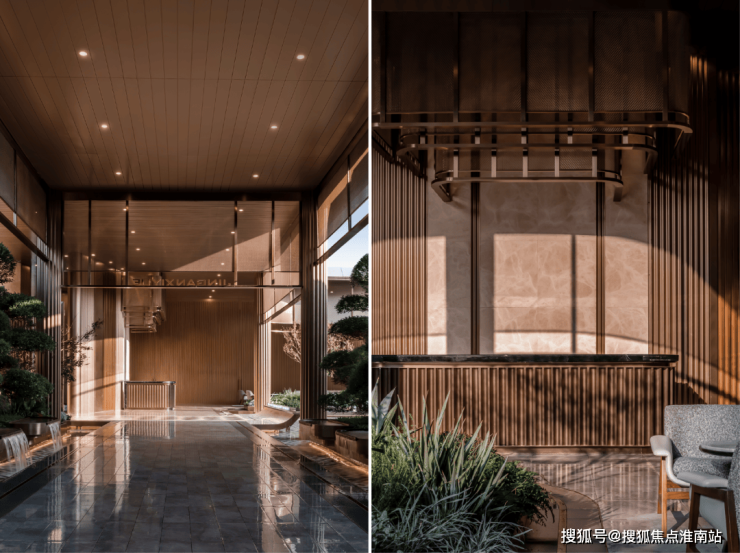 地库标准参照豪车展厅设计,采用贯穿式鱼尾灯坡道、超耐磨地坪,局部引入水磨石、水晶漆、铝饰面吊顶等高端公建化材质,以及三合一门禁系统实现无感通行,提升归家动线的品质感,对标高端酒店标准。