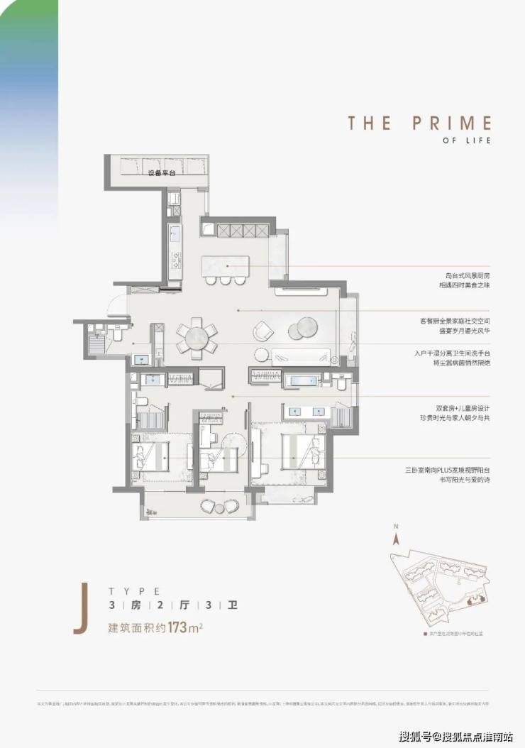 1、J户型为三房两厅两卫设计,更偏向年轻、舒适,轻奢的居住体验;