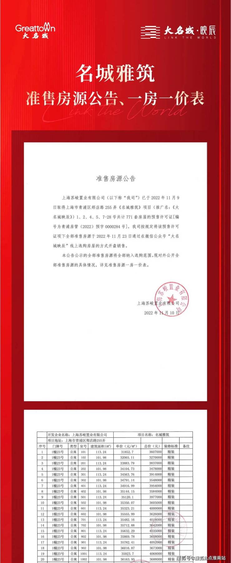在2021年12月上海第三批集中供地中,大名城以底价摘得青浦区重固镇郏店路南侧44a-01地块,成交总价13.5亿元,成交楼板价16000元/㎡,房地联动价3.48万/㎡,即如今的大名城·映辰。